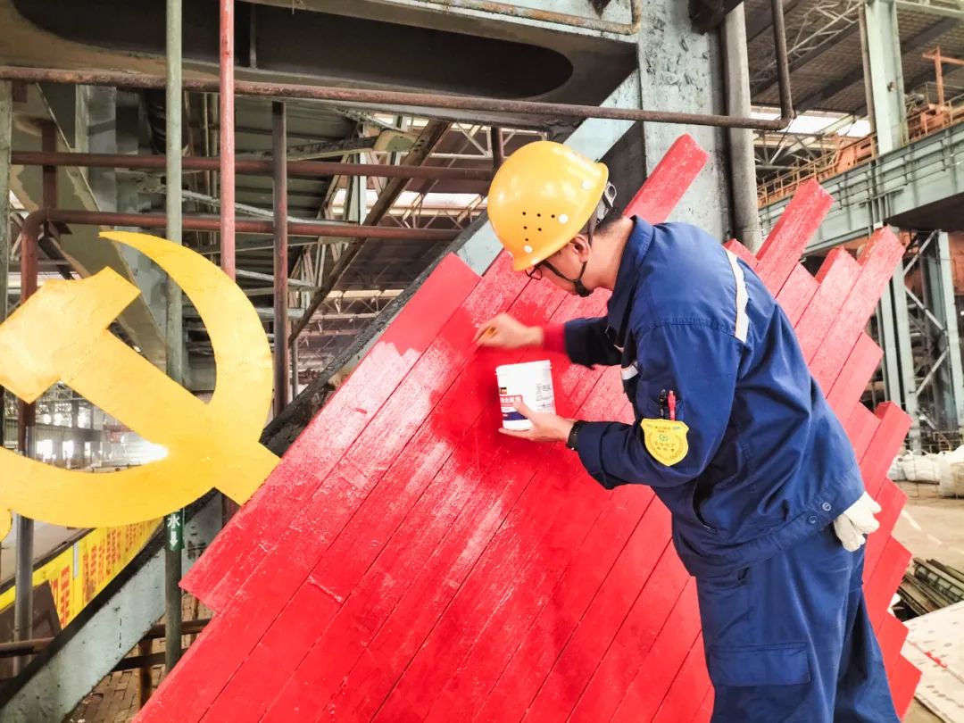 煉鋼廠員工自主設(shè)計(jì)了“永遠(yuǎn)跟黨走”紅色黨建形象展示造型及宣傳陣地,利舊現(xiàn)場(chǎng)材料全力打造紅色文化區(qū)。