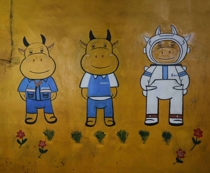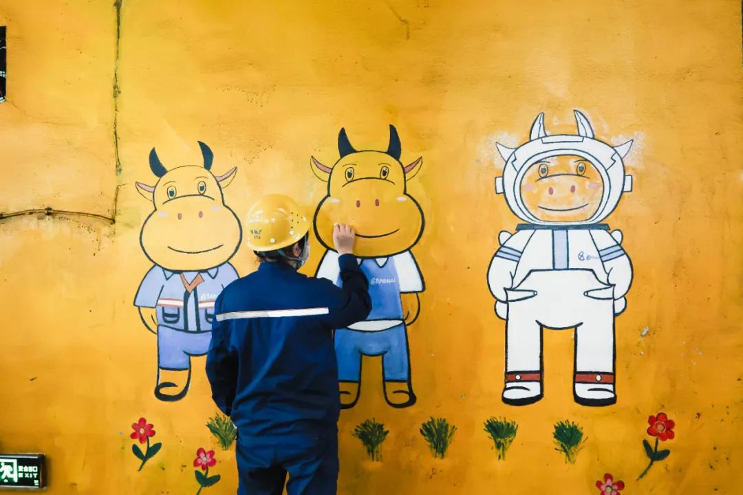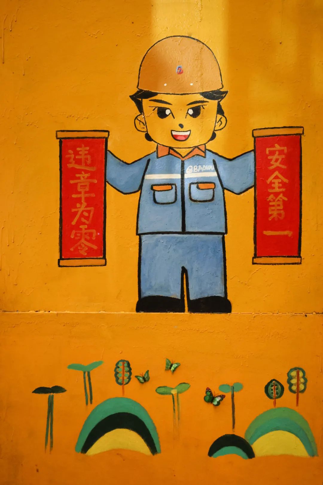 以原有休息室工具墻黃色墻面為基礎(chǔ),員工彩繪中國(guó)寶武安全卡通形象,并撰寫了“安全第一、違章為零”標(biāo)語(yǔ)。彩繪的3名可愛、幽默、帥氣、智慧的中國(guó)寶武IP安全卡通形象“牛小寶”,旨在讓員工能將安全生產(chǎn)理念入腦、入心、入行,守住“黃色”安全底線。