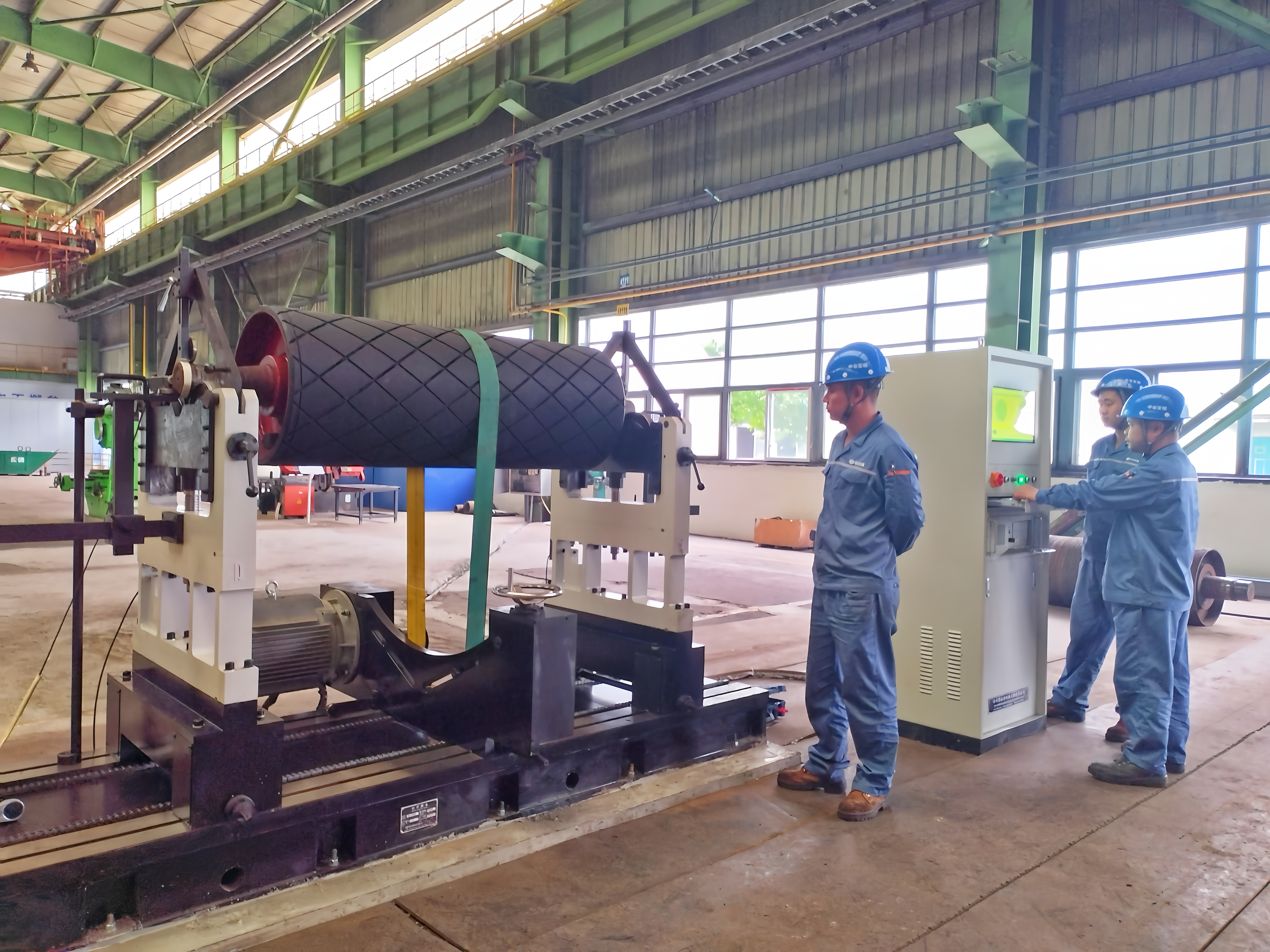 備修基地人員正在對修復中的皮帶機滾筒做動平衡測試