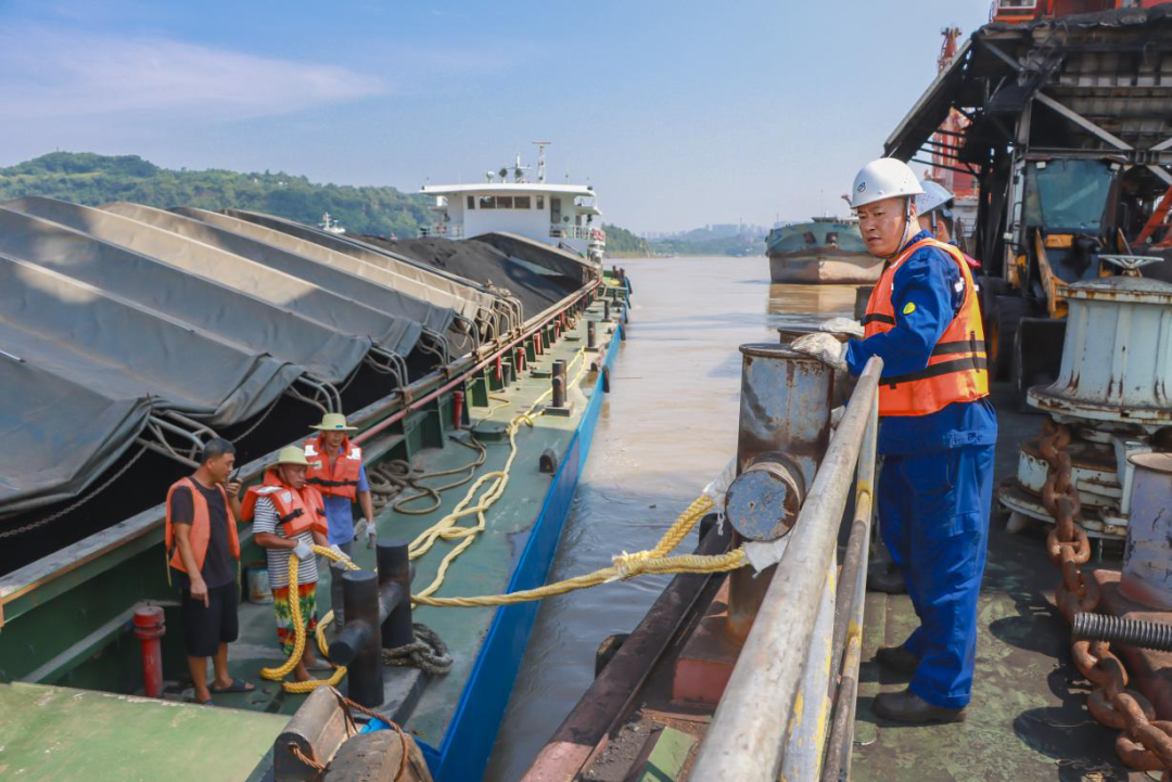 此時(shí),滿載煤炭的“重輪11”號(hào)貨輪正頂著洶涌的洪峰逆流,向一碼頭躉船靠檔滑來,洪水淹沒了“重輪11”號(hào)最高吃水線,情況危急,重慶鋼立即啟動(dòng)應(yīng)急預(yù)案,全力以赴用最快速度做好纜頭等靠檔設(shè)施檢查確認(rèn),在船方精心操控和重慶鋼碼頭人員的專業(yè)操作下,“重輪11號(hào)”順利靠上了一號(hào)碼頭躉船。