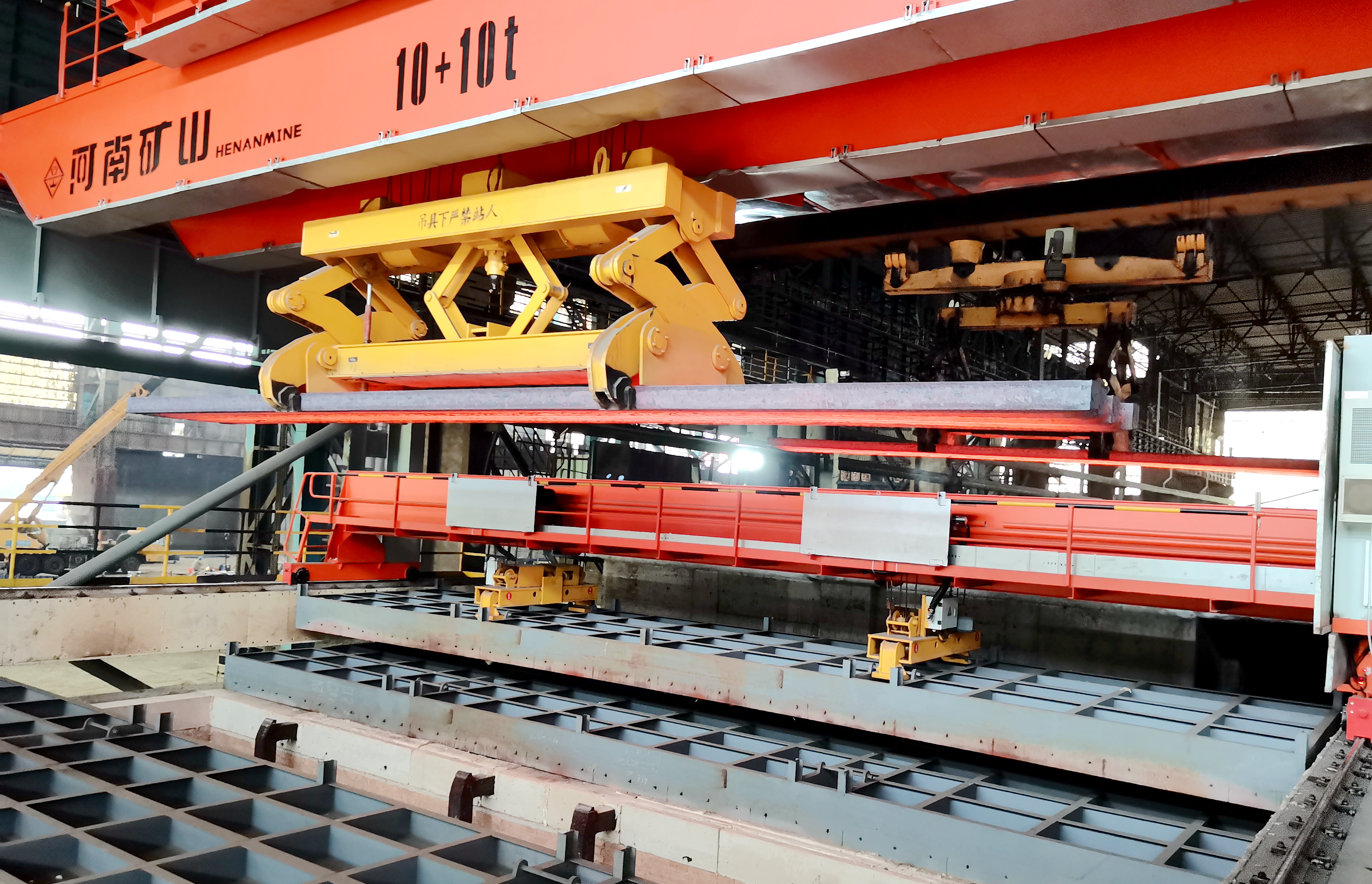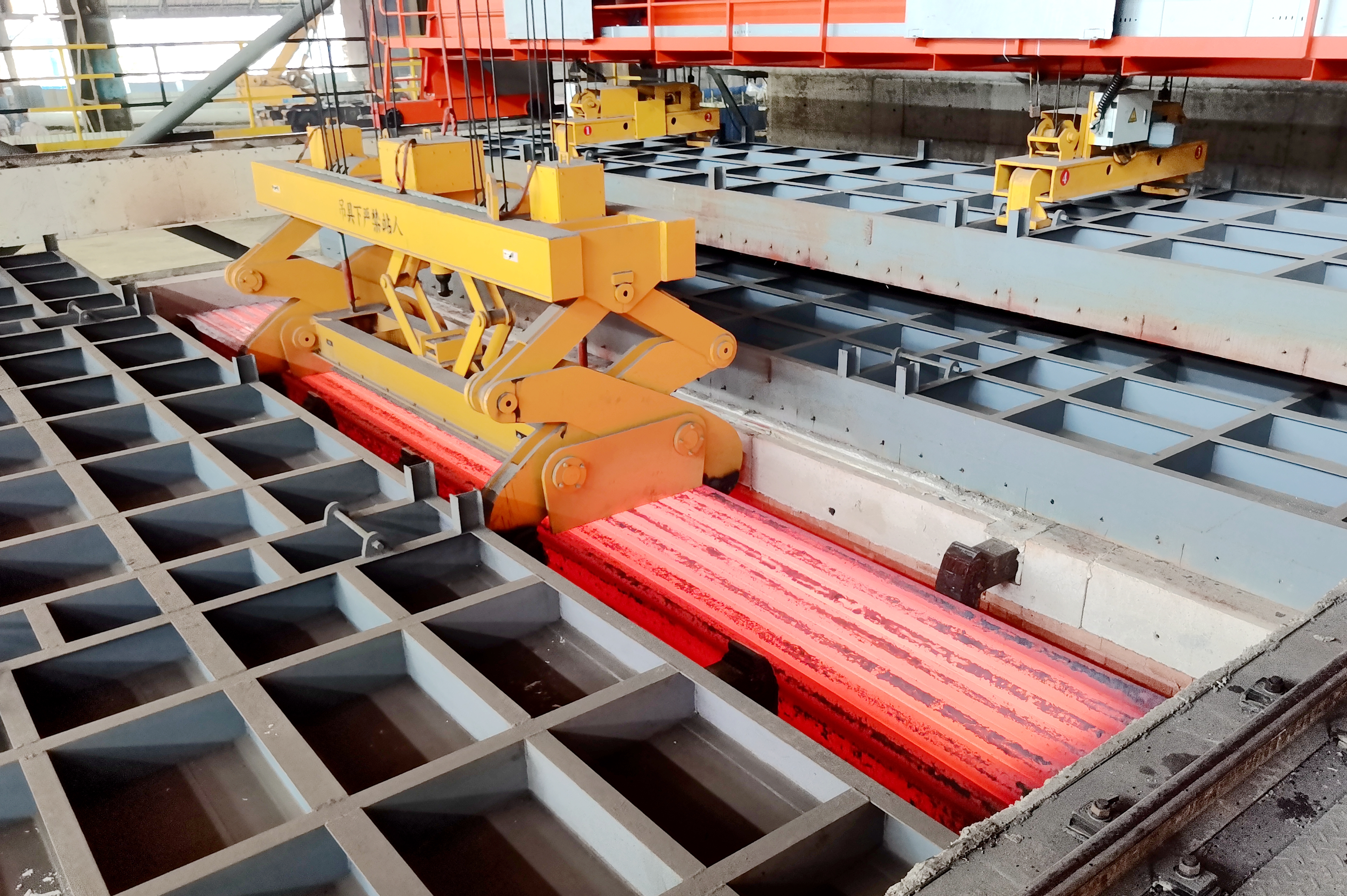 為提升生產效率,促進節能降耗,踐行綠色化、高效化、智能化、高端化的發展理念,特軋廠棒一線新增保溫坑5個,單個保溫坑容量350t,共可存儲1400t鋼坯。保溫坑和上料臺架上方設置取鋼機、揭蓋機,實現鋼坯自動進出保溫坑。當連鑄坯由保溫車從3號連鑄機冷床處裝車運輸至棒一保溫坑,經取鋼機成組吊運至保溫坑內或上料臺架上,經入爐輥道送入加熱爐加熱,從而減少下線鋼坯的熱能損失,降低加熱爐燃料消耗,加快生產節奏,提高生產效率。