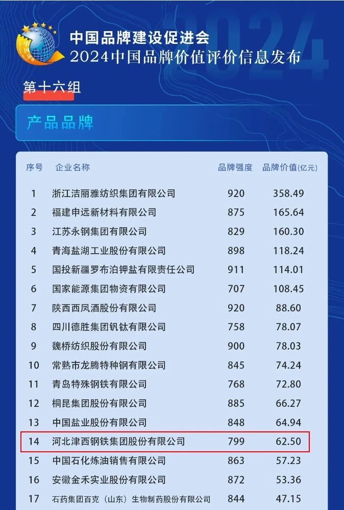 津西入選產品品牌榜單,產品品牌強度為799,品牌價值為62.50億元。