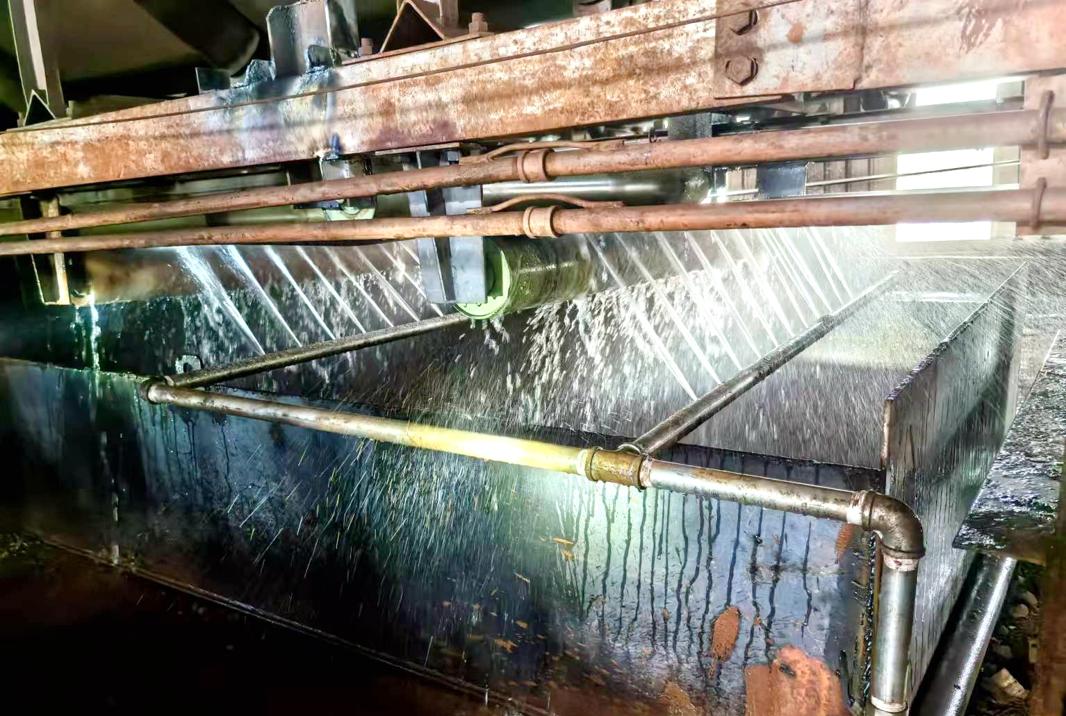 為進(jìn)一步提升改善效果,陳科創(chuàng)新團(tuán)隊(duì)繼續(xù)尋找更好的解決方法。陳科想到了自己2021年申請(qǐng)的一項(xiàng)發(fā)明專利《一種燒結(jié)配混系統(tǒng)的皮帶運(yùn)輸機(jī)清潔裝置及清洗方法》,本發(fā)明提供了一種燒結(jié)配混系統(tǒng)的皮帶運(yùn)輸機(jī)清潔裝置及清洗方法。經(jīng)得領(lǐng)導(dǎo)同意后,陳科創(chuàng)新團(tuán)隊(duì)結(jié)合現(xiàn)場(chǎng)實(shí)際制定了實(shí)施方案:在繼續(xù)優(yōu)化、保障皮帶刮刀清掃效果基礎(chǔ)上,在積料比較多的翻9、翻10和焦4的回程皮帶處安裝自動(dòng)沖洗裝置,沖洗水匯集到?jīng)_洗槽內(nèi),沖洗槽下連接水池或者水管,將沖洗水接入三級(jí)沉淀池,經(jīng)過三級(jí)沉淀后用水泵抽到通廊進(jìn)行皮帶沖洗,循環(huán)使用。