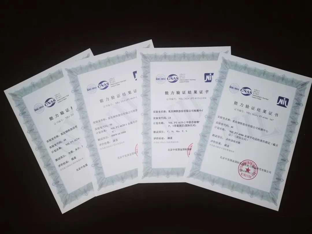 近日,重慶鋼鐵公司檢測中心獲得由中實國金能力驗證中心頒發的2024年能力驗證4個項目合格證書。同時獲得CNAS的資質認可證書,這是重慶鋼鐵檢測中心連續18年取得CNAS的資質認可。