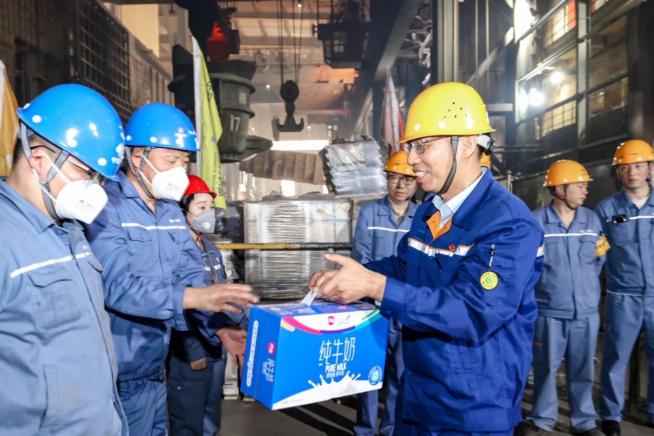 隨后,王虎祥一行來到2號轉(zhuǎn)爐年修現(xiàn)場,看望慰問奮戰(zhàn)在年修一線的干部員工及檢修協(xié)作單位人員,為他們送上牛奶、面包、飲料等物品,向他們的辛勤付出表示感謝!