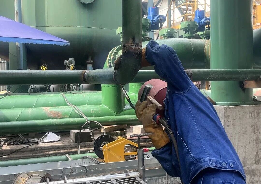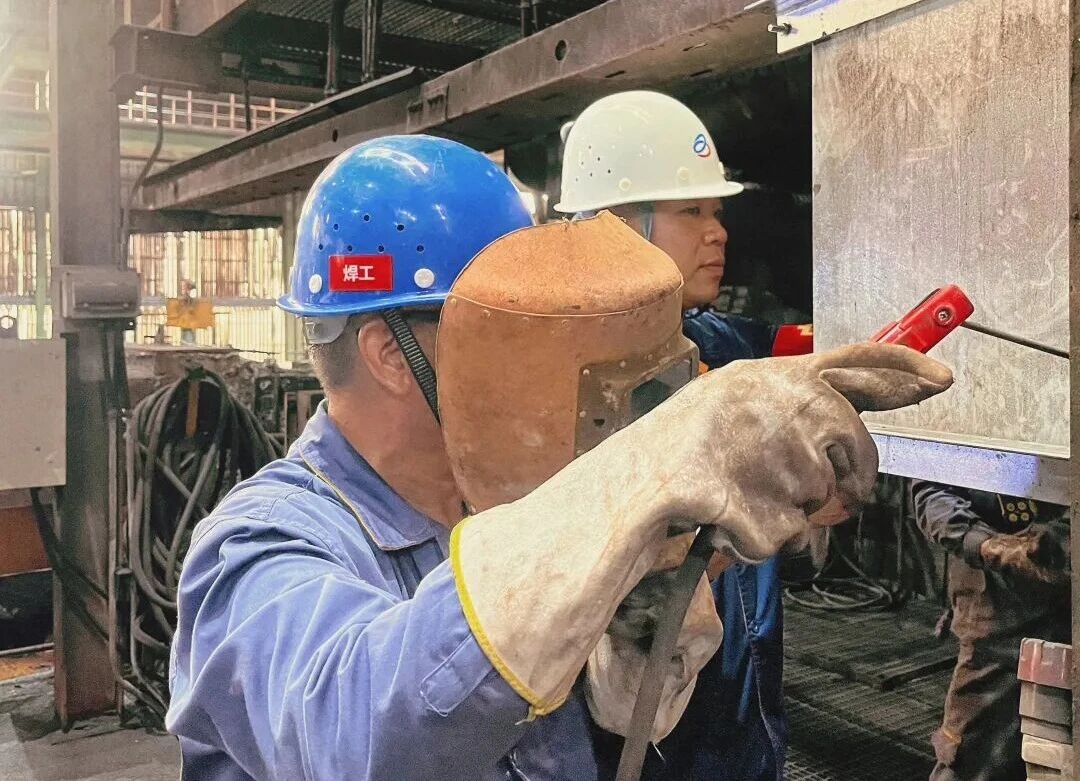 焊槍的嗞嗞聲與兩人簡(jiǎn)短的對(duì)話交織在一起,焊花隨著焊槍的移動(dòng)不斷迸發(fā),橘紅色的光團(tuán)格外醒目。