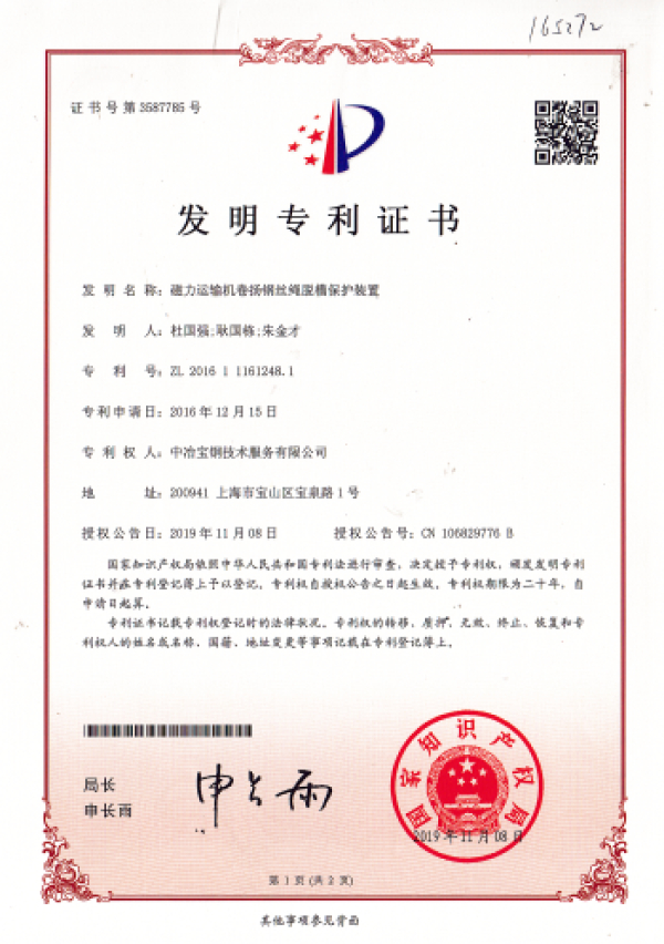 11月25日,中冶寶鋼收到國家知識產權局發來一項專利證書,“一種磁力運輸機卷揚鋼絲繩脫槽保護裝置”獲國家發明專利。