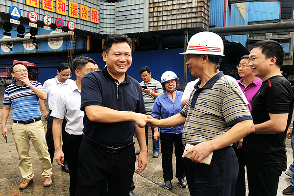 冷水江市委書記向乾勇在冷鋼黨委書記、董事長陳代富,總經(jīng)理曹革新陪同調(diào)研冷鋼。熊又華 攝