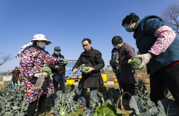 春節前幾個月,產業基地經過統籌規劃,種植了西蘭花、包菜、蒜苗等各類時令新鮮蔬菜,準備春節期間賣個好價錢。不料遇到新冠肺炎疫情,基地蔬菜出現了滯銷。脫貧戶種植的農產品,一旦賣不掉,將面臨返貧的風險。方大九鋼主動收購了部分大蒜、花菜、包菜,駐點扶貧人員柳曉剛也當起了蔬菜推銷員。他第一時間在小區群和各個相熟業主群里吆喝賣菜,同時及時將情況向鎮黨委匯報。在鎮扶貧干事李水陽協調下,成功與九江聯盛超市達成農超對接,銷售西蘭花1500斤左右。采摘當日,考慮到承包戶人力有限,柳曉剛和村工作人員一起,前往蔬菜大棚基地幫助采摘蔬菜并交到客戶手中,將承包戶的損失降到了最低,努力應對和化解因疫情給團墩村經濟發展造成的影響。