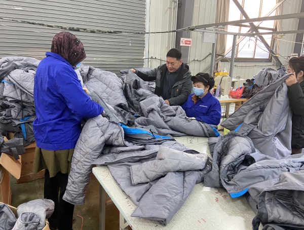 扶貧人員房甲榮在扶貧服飾公司檢驗產品