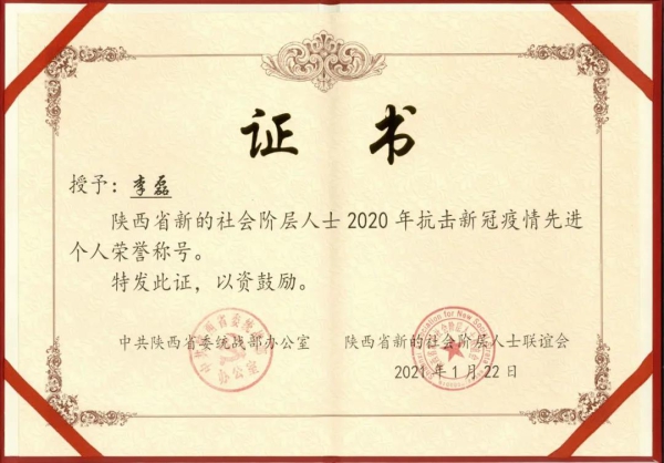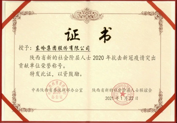 1月底,中共陜西省委統(tǒng)戰(zhàn)部、陜西省新的社會(huì)階層人士聯(lián)誼會(huì)聯(lián)合發(fā)布了《關(guān)于表彰2020年全省新的社會(huì)階層人士抗擊新冠疫情先進(jìn)集體、突出貢獻(xiàn)單位和先進(jìn)個(gè)人的決定》,東嶺集團(tuán)被授予“2020年抗擊新冠疫情突出貢獻(xiàn)單位”,集團(tuán)黨委書記、總裁李磊被授予“2020抗擊新冠疫情先進(jìn)個(gè)人”。