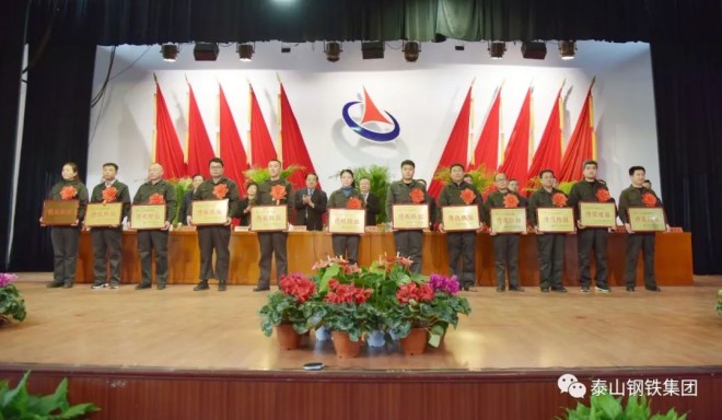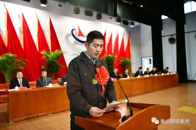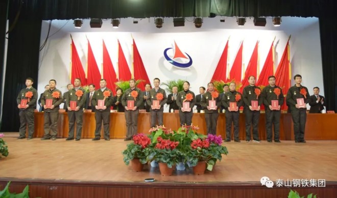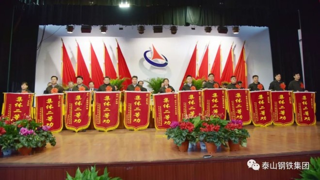 今日的中心會堂氣氛莊重熱烈。主席臺上,鮮花傲然綻放,綠植青翠欲滴,后幕正中是熠熠生輝的泰山鋼鐵集團廠徽,10面紅旗分列兩側。最上方,“山東泰山鋼鐵集團有限公司2021年度總結表彰大會”的會標在燈光的輝映下格外醒目。會場后方懸掛標語:“以黨的十九大精神為指引,以經濟效益為中心,堅持綠色低碳和高質量發展,抓好技術研發,抓好市場開拓,抓好產業升級,精益求精,聚精會神,將‘學習、實踐、創新、提高’活動推向深入。”