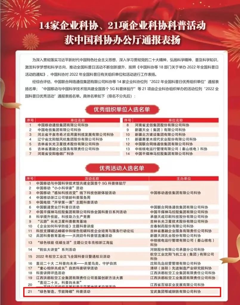 近日獲悉,在中國科協等18部門舉辦的2022年全國科普日活動中,經綜合評估,鄂城鋼鐵科協“‘綠色智造,節能降碳’科普活動”入選“2022全國科普日優秀活動”通報表揚名單。