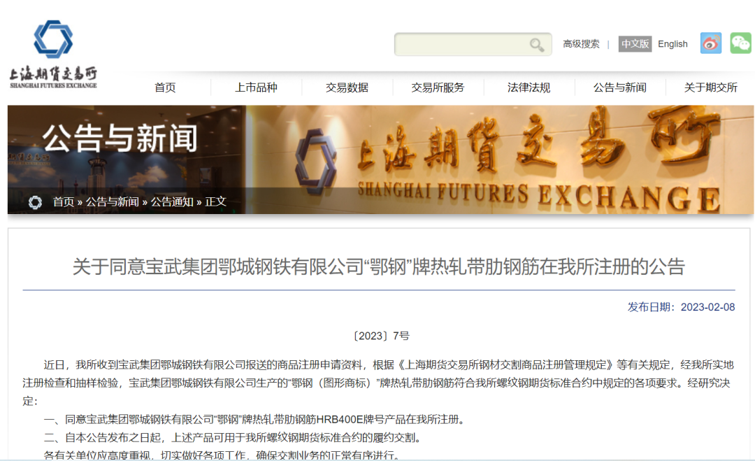 2月8日,上海期貨交易所(以下簡稱上期所)發布公告,同意寶武集團鄂城鋼鐵有限公司“鄂鋼”牌熱軋帶肋鋼筋注冊上期所交割品牌。這是自2018年以后,時隔4年“鄂鋼”牌熱軋帶肋鋼筋再次恢復成為上期所交割品牌。“鄂鋼”牌的成功注冊,標志著公司螺紋鋼產品進入高標準高質量行列,工藝技術、管理和服務體系能力均達到國內一流水平。
