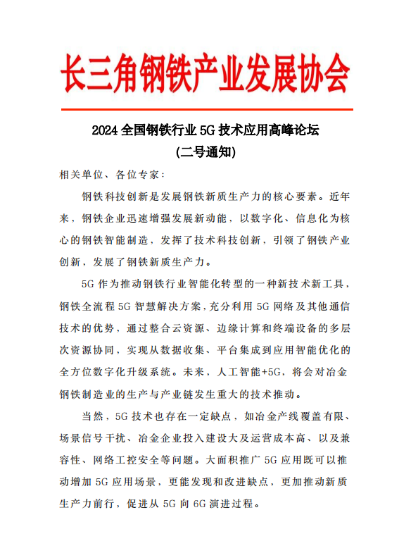 2024年全國鋼鐵行業5G技術應用高峰論壇(二號通知)