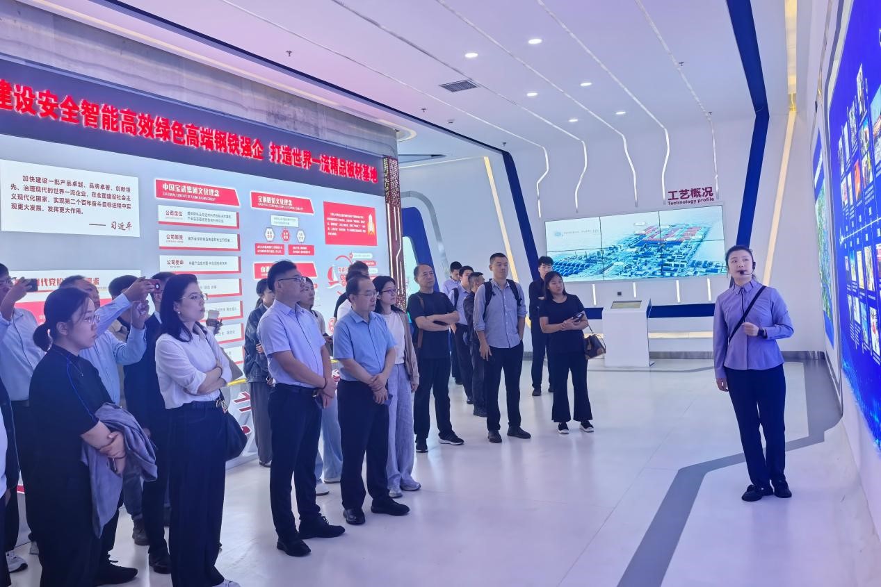 本次活動首站參觀了山鋼日照企業文化展示中心。一踏入展示中心,便被“建設安全智能高效綠色高端鋼鐵強企,打造世界一流精品板材基地”的宏偉愿景所震撼。在工作人員的細致講解下,大家詳細了解了山鋼日照的基本情況、主要工藝單元、三大主要產品(熱軋、冷軋、中厚板)、推動綠色轉型以及在智能制造方面的創新成果。這部色彩紛呈的精品基地發展簡史,讓大家對山鋼日照“共創、共進、共贏”的核心價值觀有了更深層次的理解,不僅讓參與者切身感受到了鋼鐵行業的蓬勃發展與活力,也激發了大家對期貨市場服務實體經濟的熱情和信心。
