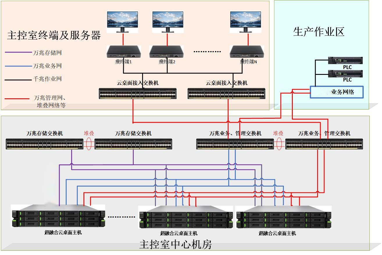 業(yè)務(wù)及管理交換機通過與基礎(chǔ)自動化交換機進行打通,實現(xiàn)網(wǎng)絡(luò)打通,可以接入視頻信號、PCL業(yè)務(wù)打通等。通過與瘦終端接入交換機打通,實現(xiàn)云桌面的訪問。