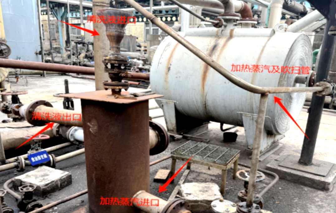 面對這一難題,該化產中心攻關小組沒有退縮。他們深入分析設備運行參數,監測換熱介質的流量與溫差,結合設備運行周期和結垢狀況檢查,精準鎖定問題根源——換熱器內部積垢導致傳熱效率下降。找到問題根源后,大家創新性地提出了外循環堿洗油路的方法,并動手制作清洗裝置。為了踐行綠色環保與降本增效理念,團隊還利用廢舊管道,打造出了一個DN350mm的清洗罐,罐上配備加液漏斗、DN100mm進液管和DN25mm加熱蒸汽小管。