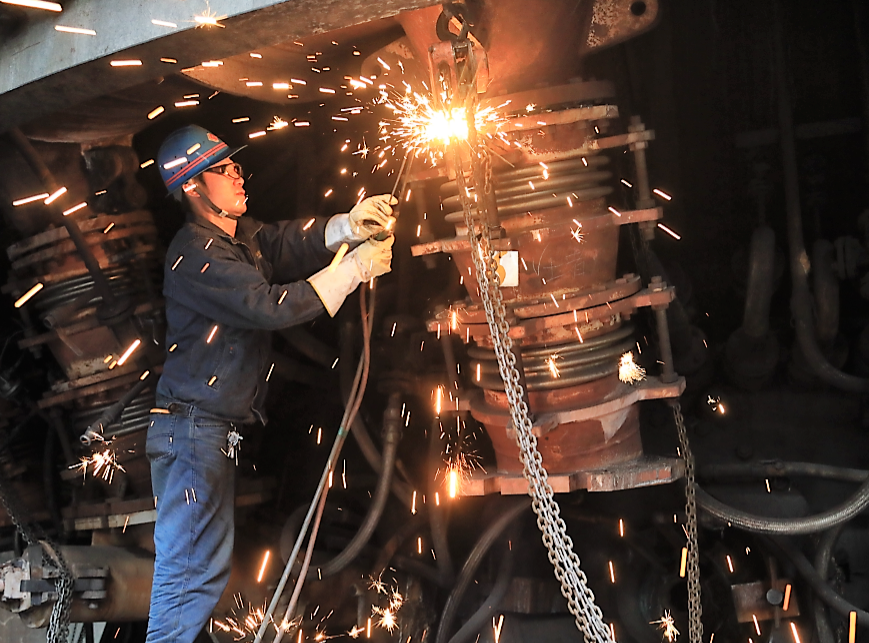 鐵花飛濺,不能阻擋鋼鐵人戰(zhàn)斗的勇氣。爐前鉗工正在用氧槍切割風(fēng)口管道膨脹節(jié)上的螺絲,以盡快拆卸掉高溫下受損變形的膨脹節(jié),為后續(xù)環(huán)節(jié)贏得時(shí)間。