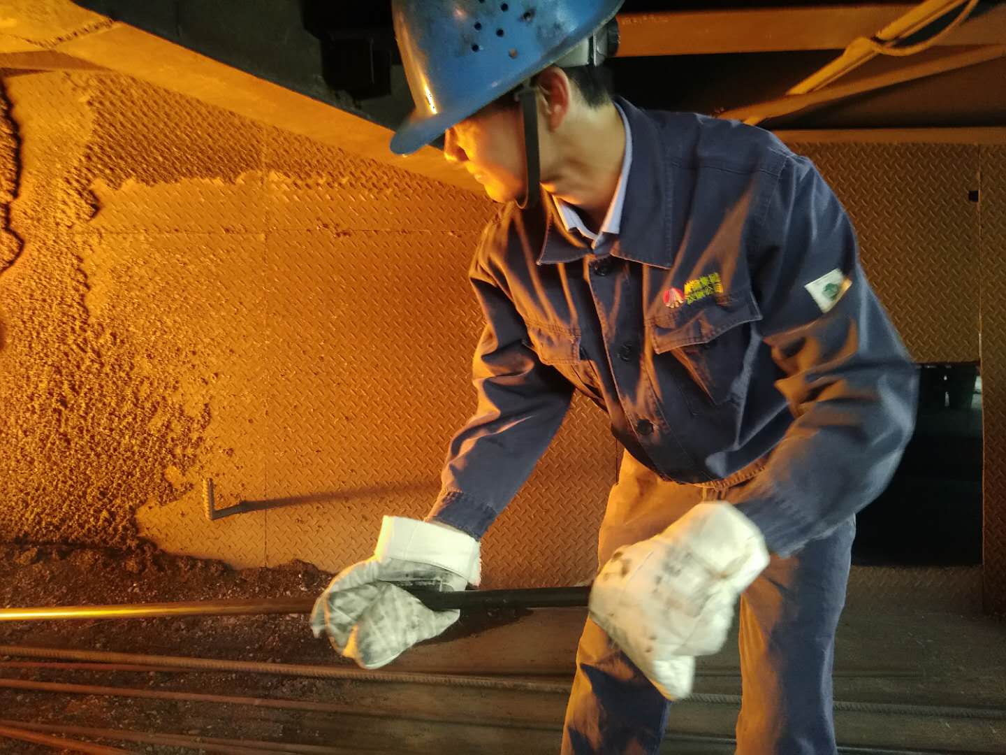 緊接著,筆者來到了鑄運車間,這里同樣是一幅熱火朝天的繁忙景象。還沒進現場,就先聽到刺耳的炮錘敲擊聲。走進生產現場,作業環境讓人覺得悶熱得透不過氣來,站在修罐庫旁邊的鐵水罐邊上才幾分鐘,記者就滿頭大汗,工作服都濕透了。班長楊坤正在和工友們商量下線罐的修補方式,他們在精心保障高爐鐵水罐的使用,為高爐渣鐵及時排放提供保證,他們全然不顧高溫的“炙烤”,全神貫注忙著自己手中的活,有條不紊的進行著各項工作。