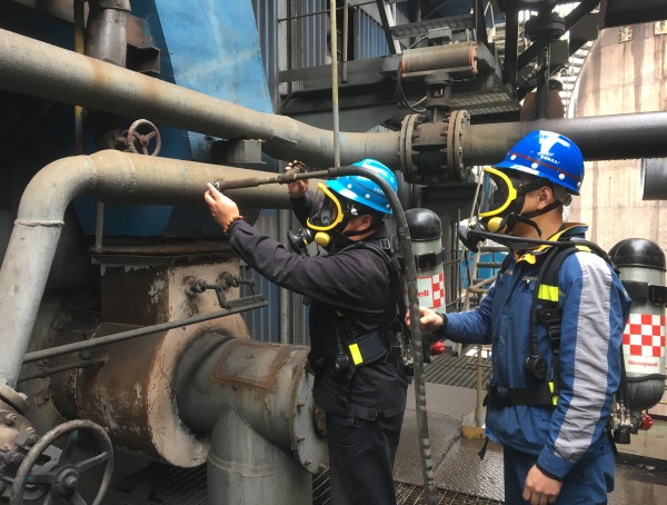 此次演練以2號35t/h鍋爐高爐煤氣泄露為背景。當突發高爐煤氣泄露事故時,崗位員工能迅速發現泄露點,及時匯報應急指揮小組和相關部門,并迅速穿戴好空氣呼吸器等安全裝備進行應急救援處理,并根據泄漏點大小和風向等確認高爐煤氣的擴散范圍、做好危險區域警戒,進而科學有序地分步驟做好后續各項應急應對舉措。