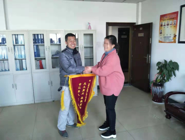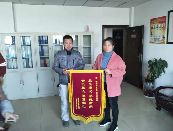 這是2020年1月8日上午9:30,在華菱漣鋼冷軋板廠綜合科辦公室里筆者看到落水女青年劉某的母親毛女士贈送錦旗給“救人英雄”關(guān)金普時的場景。