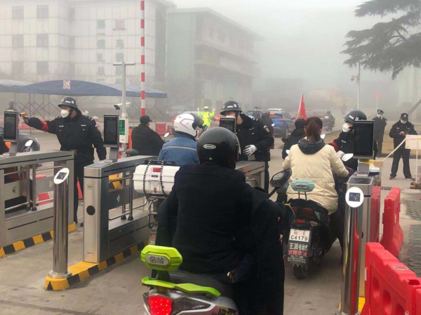 圖為特勤隊員們在門崗對進入廠區行人進行體溫測量