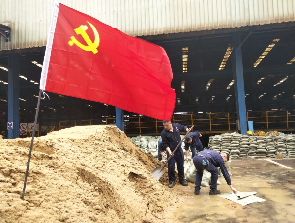 方大九鋼軋鋼廠黨員突擊隊正在裝沙袋