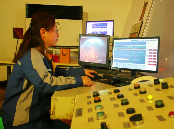圖為臺(tái)下操作女工彭麗霞通過MMI畫面了解鑄坯生產(chǎn)情況