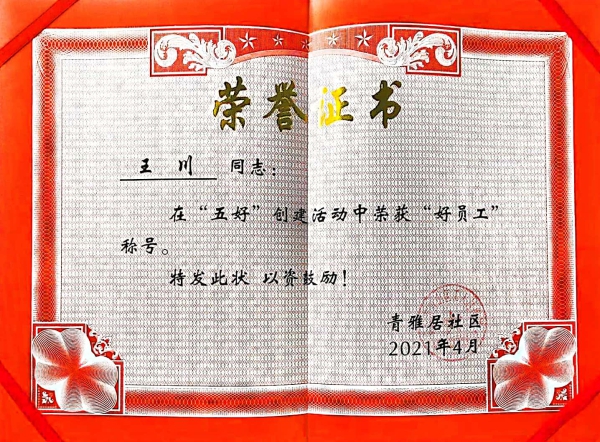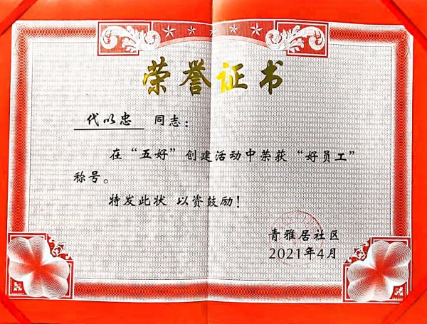 據悉,為貫徹落實好青山區委區政府“黨建引領 ‘五好’創建”活動,弘揚勞模精神、勞動精神、工匠精神,青山區總工會在全區組織開展在單位爭做“好員工”的創建活動。在此次青雅居社區“好員工”評選活動中,共有30個獲獎名額,其中公司2名員工獲獎,代表了當地社區對五冶人