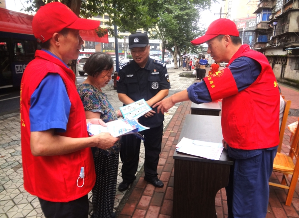 圖為志愿者在社區(qū)發(fā)放防詐騙小冊子