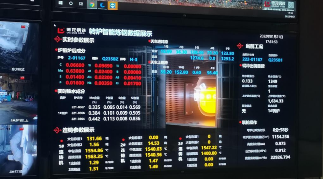 隨后,他向小分隊介紹起了身后的轉爐智能煉鋼數據中控項目。德龍鋼鐵作為國家環保A級企業,全國首家在生產鋼鐵企業國家4A級旅游景區,國家高新技術企業,已經成為行業的環保標桿企業!2022年德龍集團公司定位為“變革年”,成立智能制造推進工作領導小組,主攻生產工序數字智能化升級和改造,梳理出“3D”臟、累、險崗位,開展縱向到邊、橫向到底優化升級,全力推進智慧管控“567”中心建設,力爭實現“雙標桿”!而煉鋼智能中控項目的靈感來自于2021年建成的智能環保管控中心項目,大屏上通過對各環保六參數監測微站(PM10,PM2.5,SO2,NO2,CO和O3)進行成像顯示,全廠區45個監測微站實現了集動態監測、數字管控、全域比對、圖文成像于一體,形成了數字化智能環保管控中心,成為環保管理的重要措施和抓手,獲得市、區環保部門的一致好評。