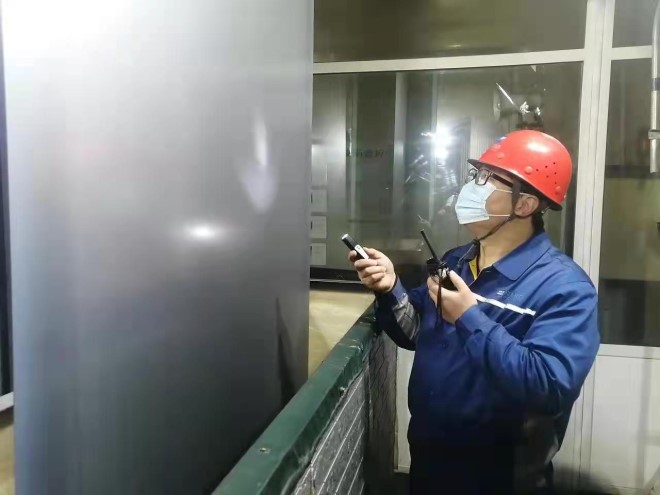 十幾分鐘后,第一卷到達檢查站。早就等在這里的質檢員張書青拿著手電對帶鋼表面進行檢查。