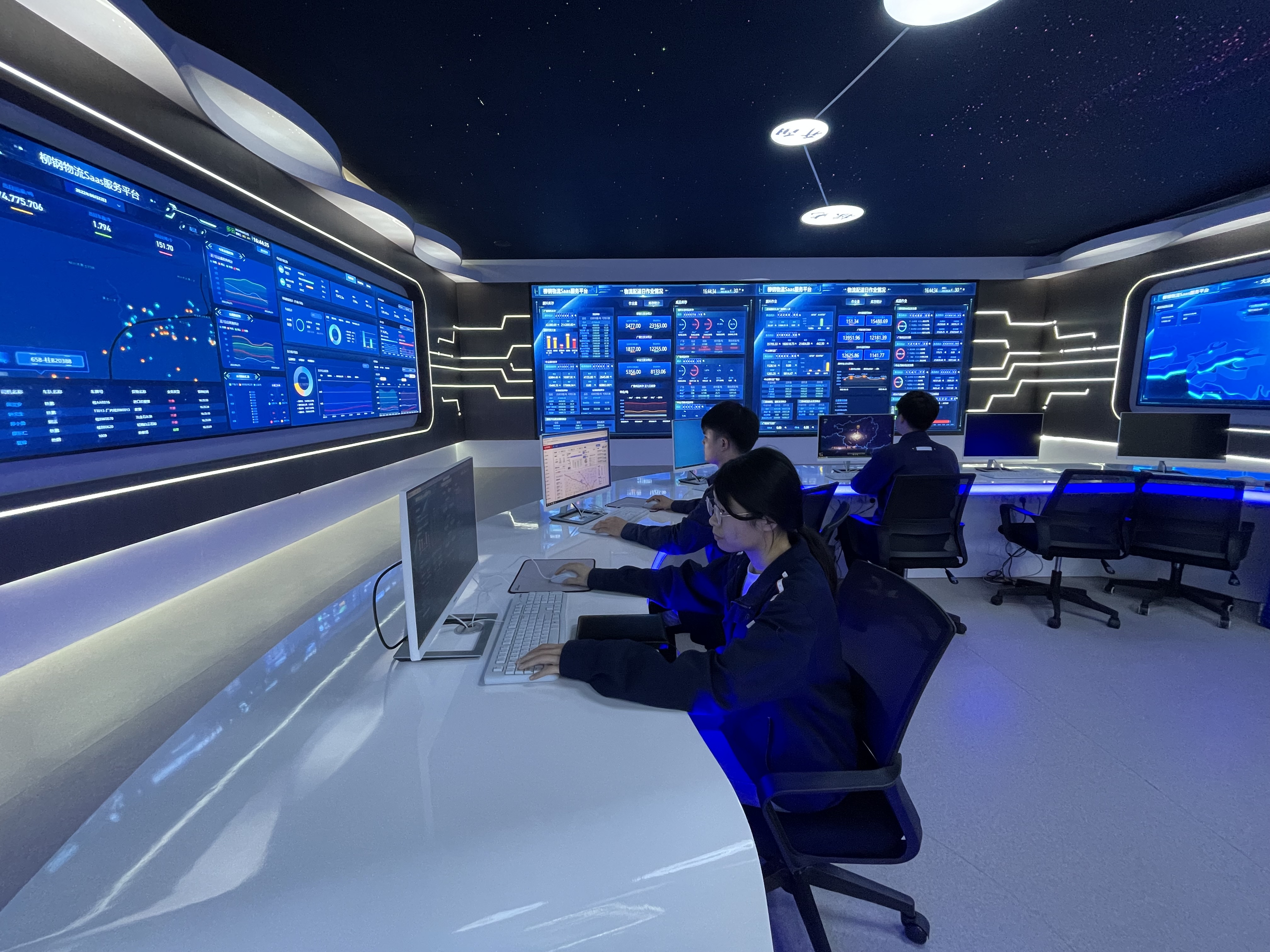 調度中心三面環繞的大屏上顯示著實時的車輛運輸信息,車輛定位、實時路況、當天運量等等數據在屏幕上跳動變化,科幻而壯觀。