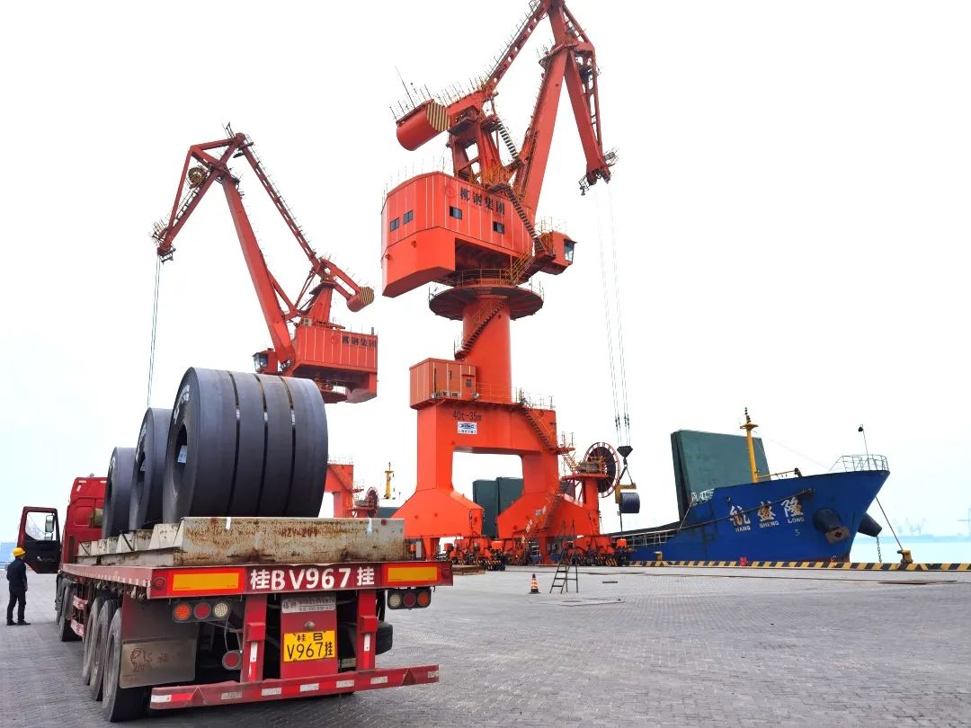 防城港廣西鋼鐵基地萬噸碼頭調運現場,拉運成品鋼材的卡車往來不絕,或運送鋼材出入,或停車排隊等待吊裝。幾臺行車、吊機協同作業,低沉的機器轟鳴聲和指揮行車的哨聲交織在一起,像是在協奏激昂的生產交響曲。