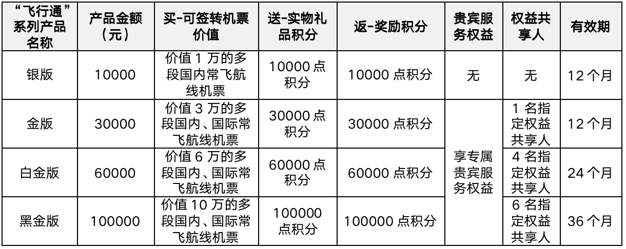 現(xiàn)階段“飛行通”產(chǎn)品包括黑金版、白金版、金版、銀版四檔。旅客購買產(chǎn)品后,即可獲得對應(yīng)價值的可簽轉(zhuǎn)機票,還可獲贈等額數(shù)量的實物禮品積分和等額數(shù)量的獎勵積分,即享“買1送1返1”3重權(quán)益。例如購買售價10萬元的“飛行通”黑金版產(chǎn)品后,除獲得價值10萬元的可簽轉(zhuǎn)機票外,根據(jù)已交付可簽轉(zhuǎn)機票的使用進度,旅客還將陸續(xù)獲贈可在“飛行通”產(chǎn)品專區(qū)內(nèi)使用的10萬點獎勵積分,以及可在“飛行通”產(chǎn)品專區(qū)禮品兌換站使用的10萬點實物禮品積分。獎勵積分可用于兌換等額標價的機票或其他附加航空服務(wù)產(chǎn)品,禮品積分可用于在禮品兌換站兌換精選實物禮品。通過“飛行通”產(chǎn)品訂座或兌換的機票均可享受便捷退改權(quán)益。