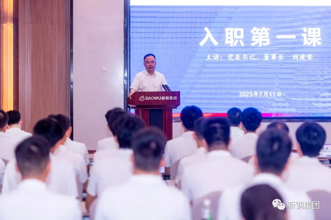 新鋼集團(tuán)黨委書記、董事長(zhǎng)劉建榮在開班儀式上為新進(jìn)大學(xué)生講授入職第一課。