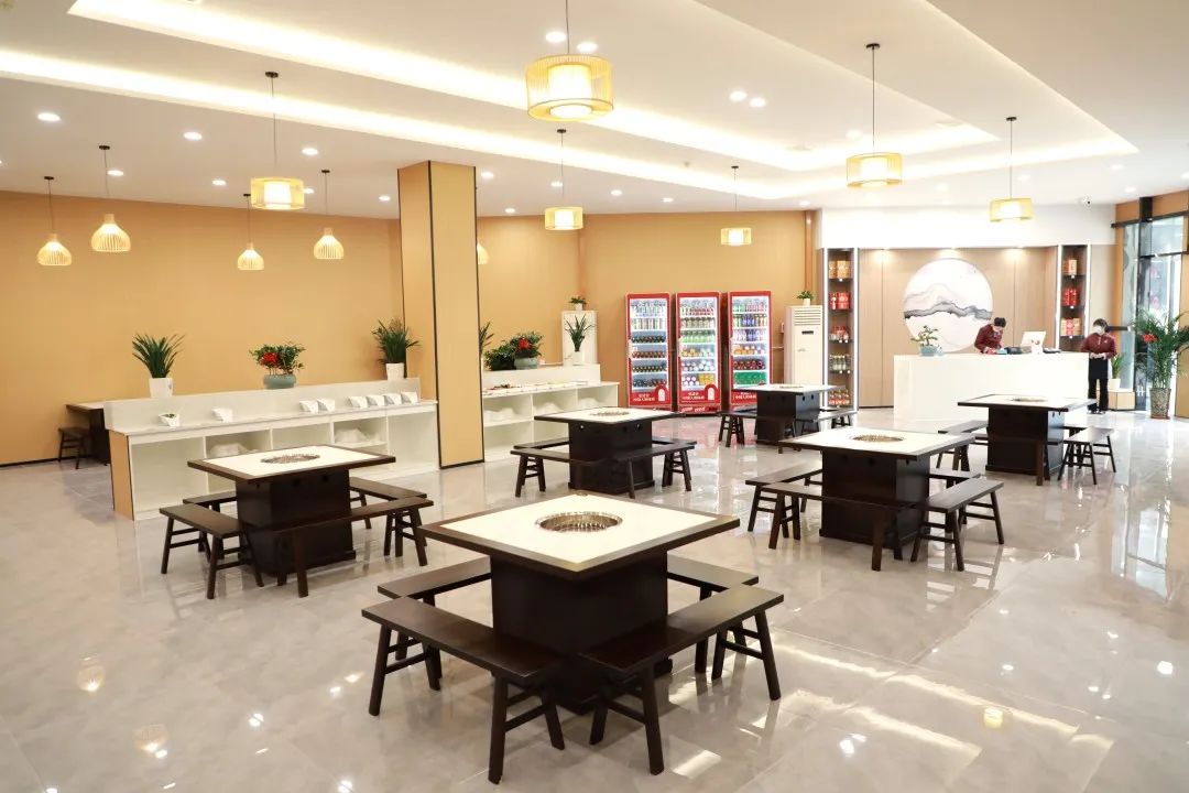 新裝的閑趣火鍋整體風格簡約溫馨、大氣舒適就餐區座椅排列整齊在燈光的加持下空間更顯明亮通透令人身心愉悅