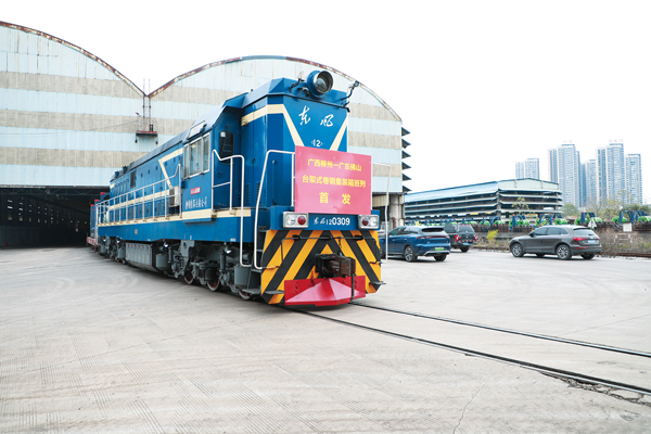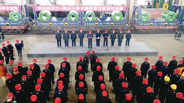 圖為首列“柳州—佛山”臺架式鋼卷集裝箱班列首發(fā)儀式現(xiàn)場。