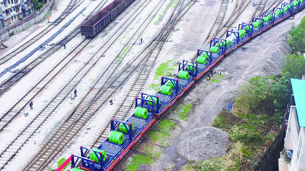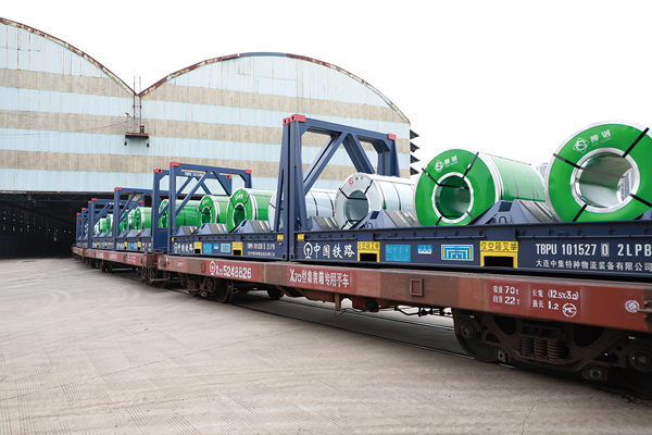 圖為臺架式鋼卷集裝箱班列運(yùn)輸現(xiàn)場。