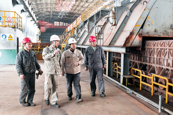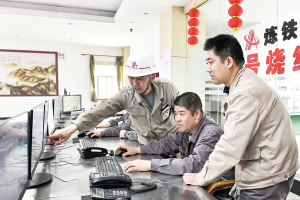 圖為該作業(yè)部職工在觀察燒結料的質量。
