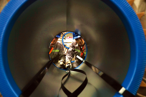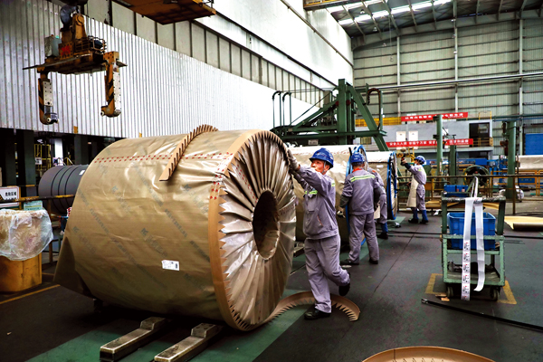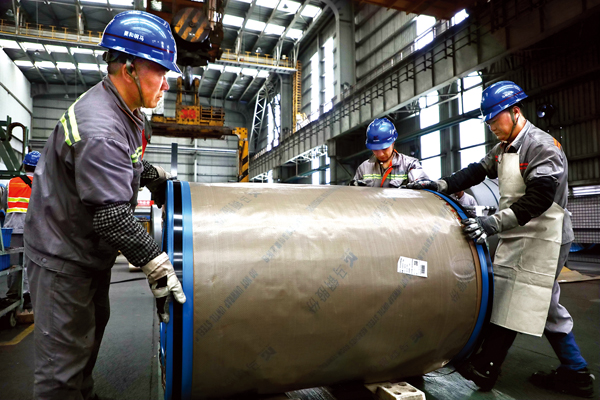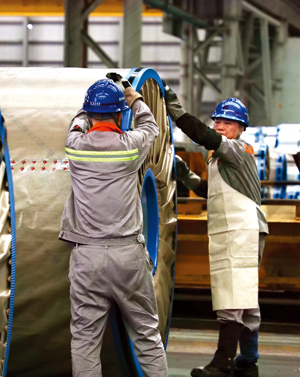 圖為該公司職工正在為冷軋鋼卷包裝防銹紙。
