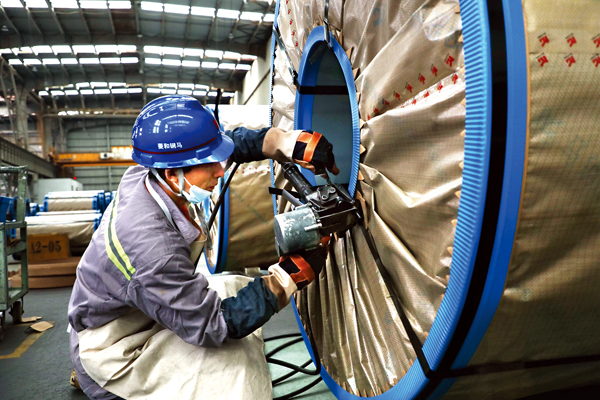 圖為該公司職工正在用鋼帶為產(chǎn)品打捆。