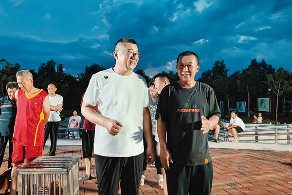 圖為宋洪猛和蘇斌芳下班后到單位附近的廣場上排練。