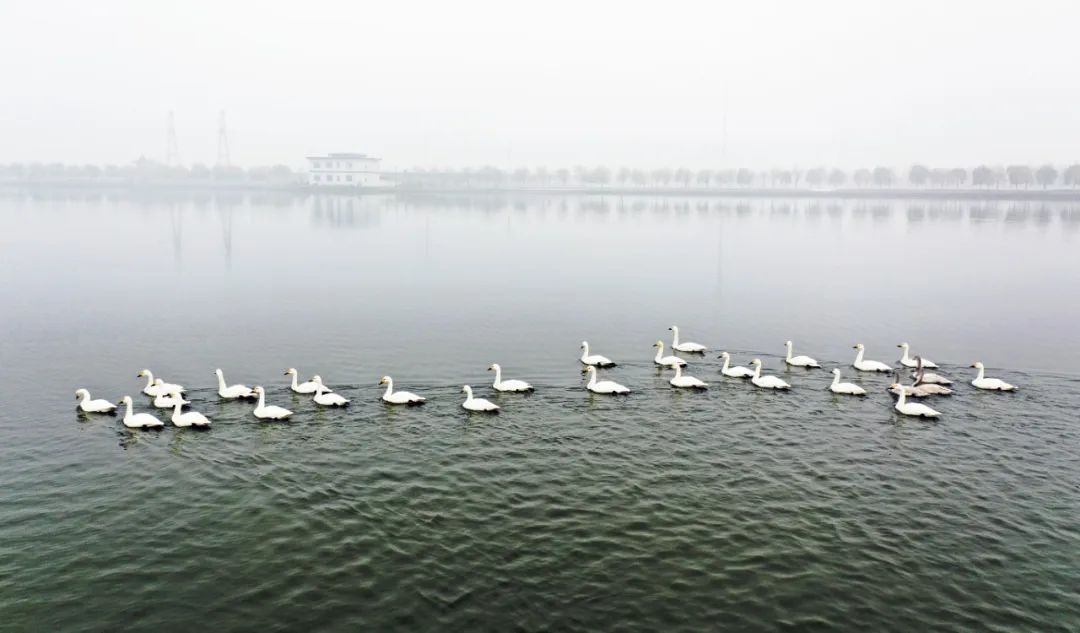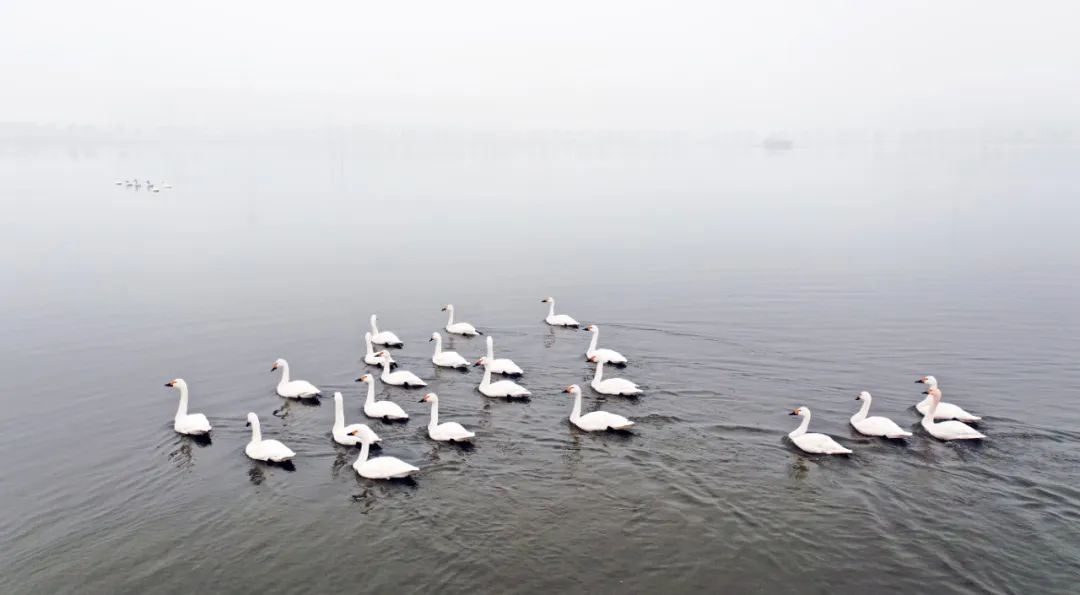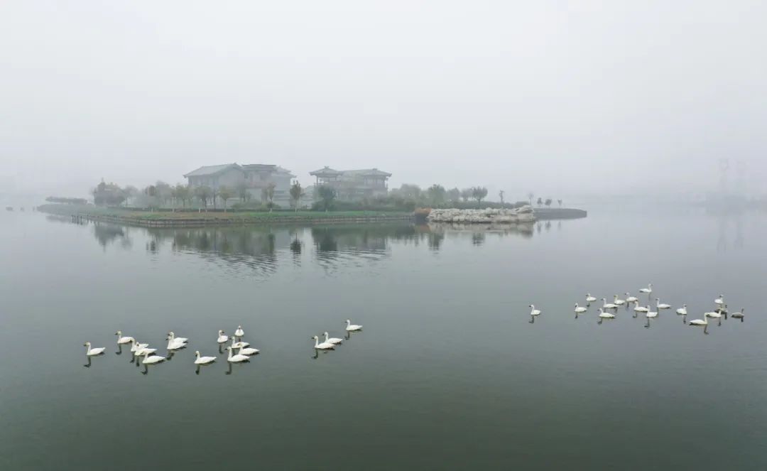 初冬的一場雨水過后,晉南鋼鐵太子湖被一層薄紗般的霧氣籠罩,在這如夢似幻的天氣,大批天鵝翩翩飛臨太子湖棲息。與往年不同的是,今年飛臨此地的天鵝數量多達上百只,成為企業綠色低碳發展的最美“代言人”。