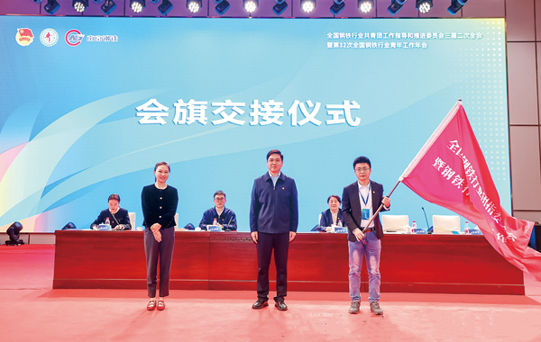圖為下一屆會議承辦單位首鋼團(tuán)委接受會旗。