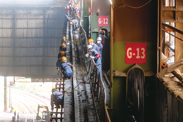 圖為新鋼維檢中心組織職工進行燒結機臺車更換任務。