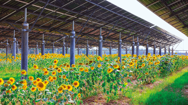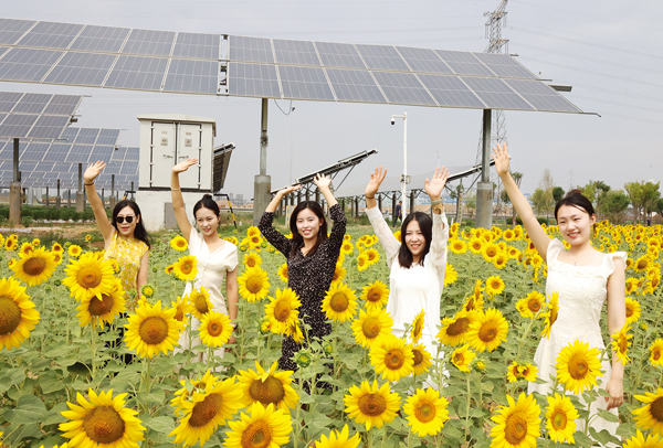 圖為在該公司光伏發電大棚下,成千上萬株向日葵競相開放。