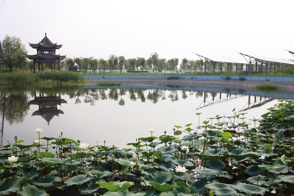 圖為在太子湖畔遠眺廠區,湖面上是晉南鋼鐵水上光伏發電項目。