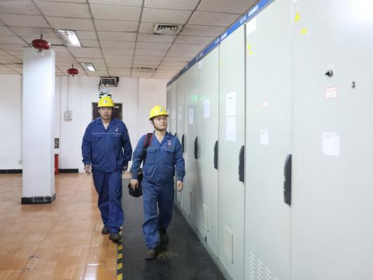 汪彬與同事在煉鐵廠2號高爐主控配電室進行點檢